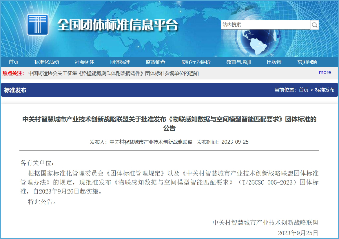 日前,经中关村智慧城市产业技术创新战略联盟批准,国家重点研发计划课题成果——《物联感知数据与空间模型智能匹配要求》团体标准(T/ZGCSC 005—2023)正式对外发布实施。本标准由软通智慧牵头,联合软通动力、北京航空航天大学、广联达、太极股份、北科院资源环境研究所、中国科学院地理科学与资源研究所、中国城市科学研究会、中国联通智能城市研究院、中国测绘科学研究院等近20家企业、高校和科研院所共同编制。