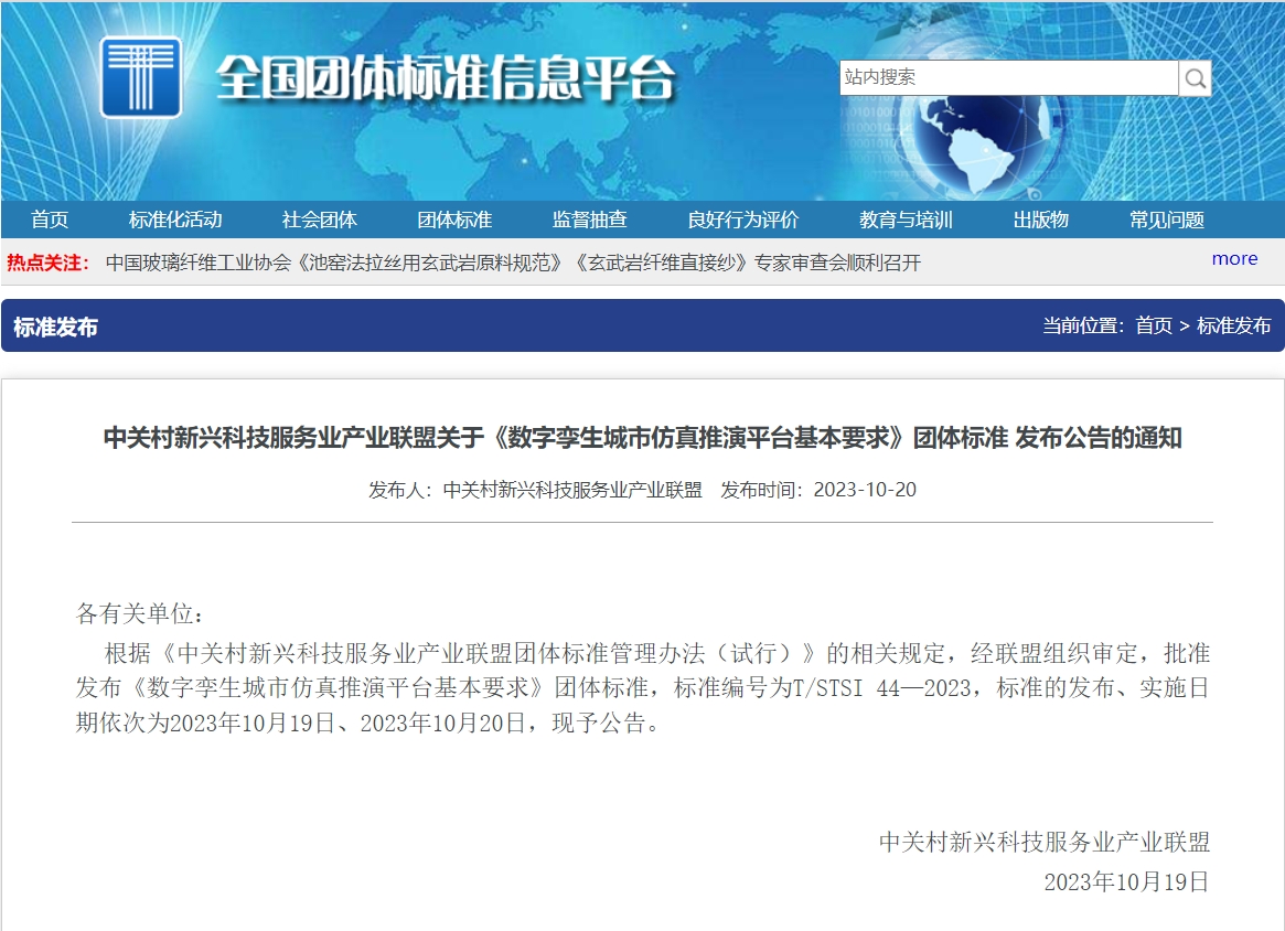 10月20日,经中关村新兴科技服务业产业联盟审定批准,国家重点研发计划课题成果——《数字孪生城市仿真推演平台基本要求》团体标准(标准编号:T/STSI44—2023)正式对外发布实施。