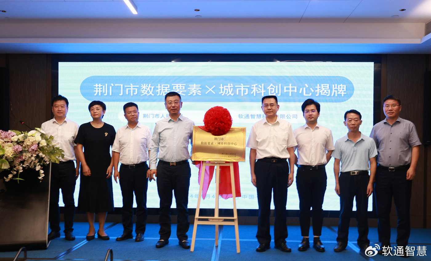 在揭牌环节上,荆门市政府副市长陈实、软通智慧首席运营官李进共同为荆门市数据要素×科创中心揭牌。荆门市政府副秘书长陈新民、市数据局局长李立军、荆门城投董事长徐敏,软通智慧数据要素首席科学家林镇阳、软通智慧华中大区执行总裁张学广、湖北联通战略客户服务中心总经理李昀照共同见证了这一璀璨时刻。