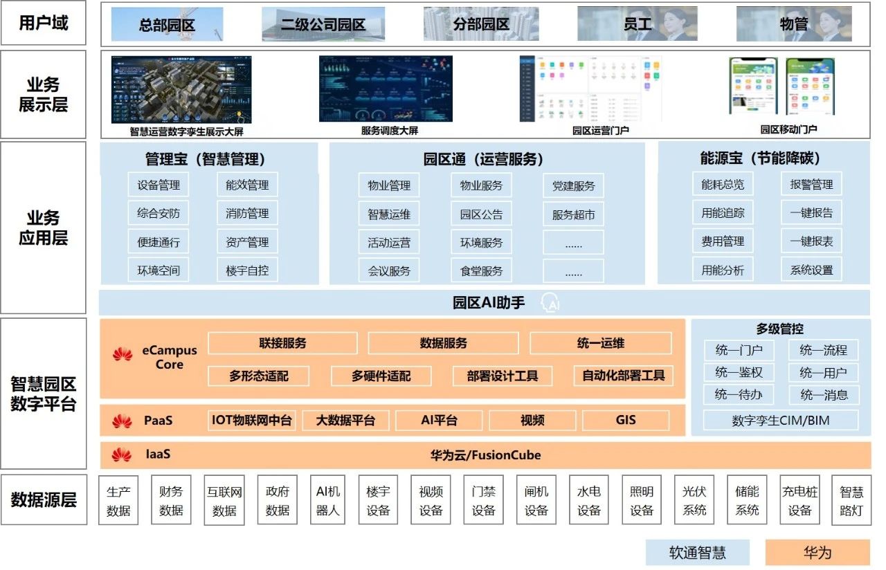 为推动万物互联的未来园区逐步从理念走向现实,满足央国企客户多园区、多层级、多业态的管理需求,软通智慧与华为联合打造总部办公园区解决方案,通过建立覆盖全集团后勤保障业务的统一管理智能化平台,助力园区实现全面感知、泛在连接,促进各种行政后勤保障业务向数字化、智慧化、简单化、高效化转变,全面提升园区整体运营效率。