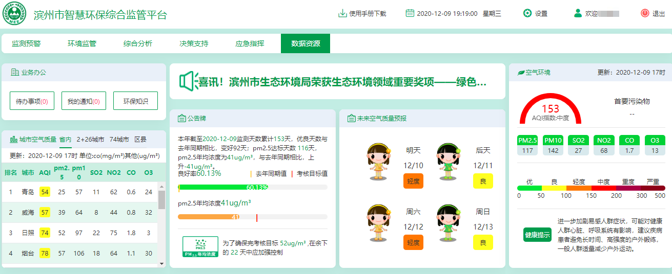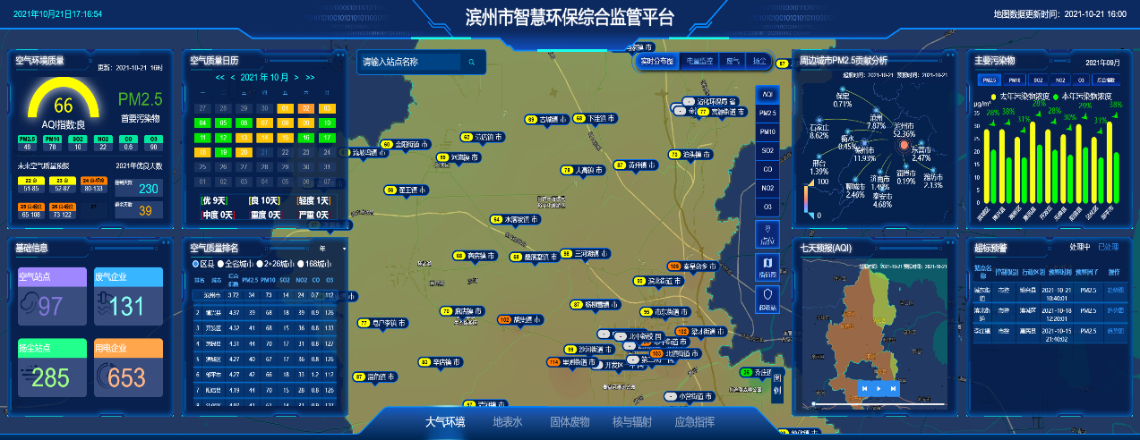 依托滨州市政务云系统,部署建设了大气环境、水环境、污染源、电量分析等25个业务系统,构建智慧环保综合监管平台。