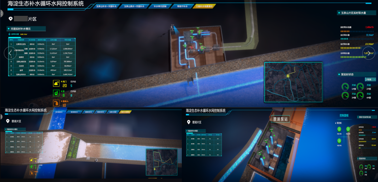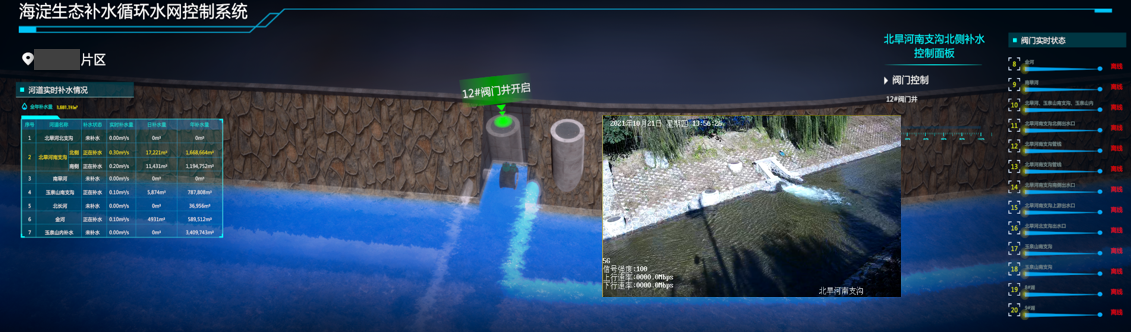 通过数字孪生和5G通讯技术,构建水质改善模型和城市排水防涝模型,实现补水河道流量的实时监测和补水循环水网设备的可视化和智能控制。