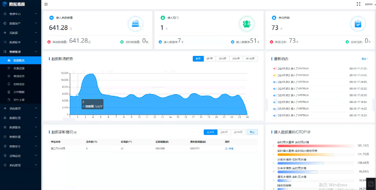 通过数据资源获取、整合集成各类数据、建立水利数据资源目录、数据更新机制,汇集水利基础数据、监测数据、业务数据、空间地理数据、视频监控等数据。